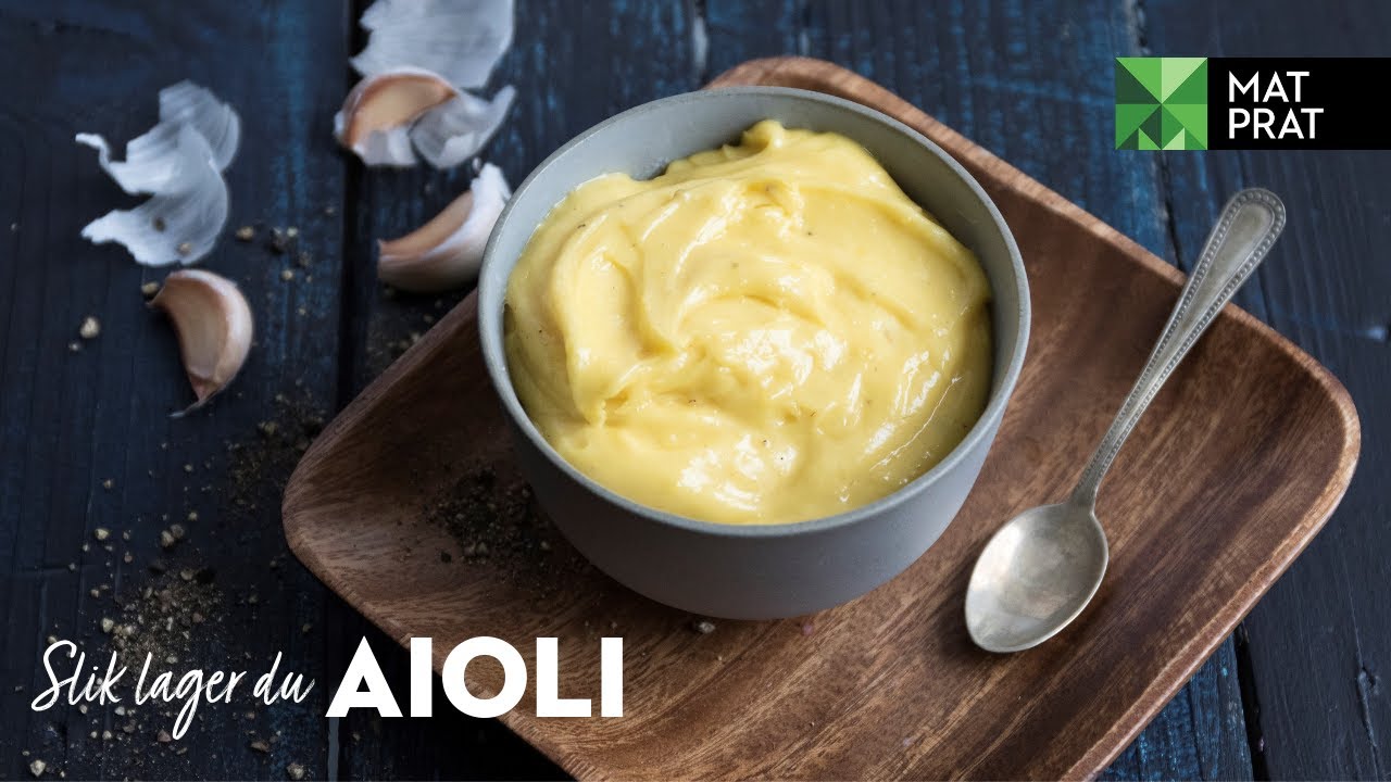 Lag gjerne en stor porsjon i hurtigmikser. Om aïolien skulle skille seg, begynner du på nytt med en eggeplomme og visper inn den mislykkede sausen litt etter litt.